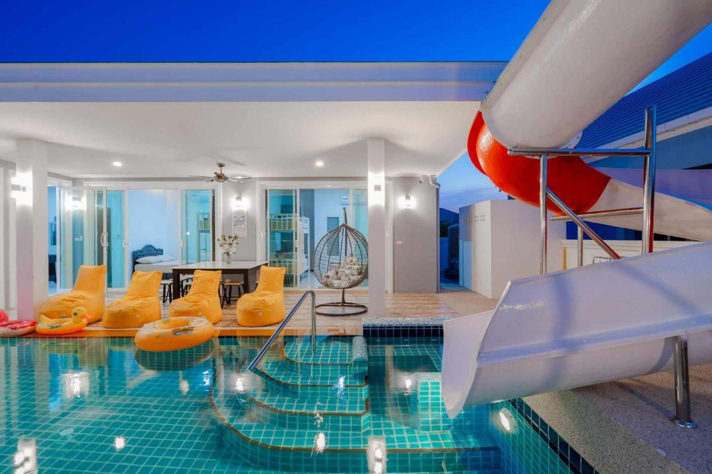 Set in Cha Am, 4.7 km from Cha-am Railway Station and 4.9 km from Cha-am Forest Park, พลอยพูลวิลล่า ชะอำ 2 Poolvilla Cha-am 2 offers a garden and air conditioning. This property offers access to a patio, a pool table, free private parking and free WiFi. The villa features an outdoor swimming pool with a water slide, as well as a hot tub and a shared kitchen.