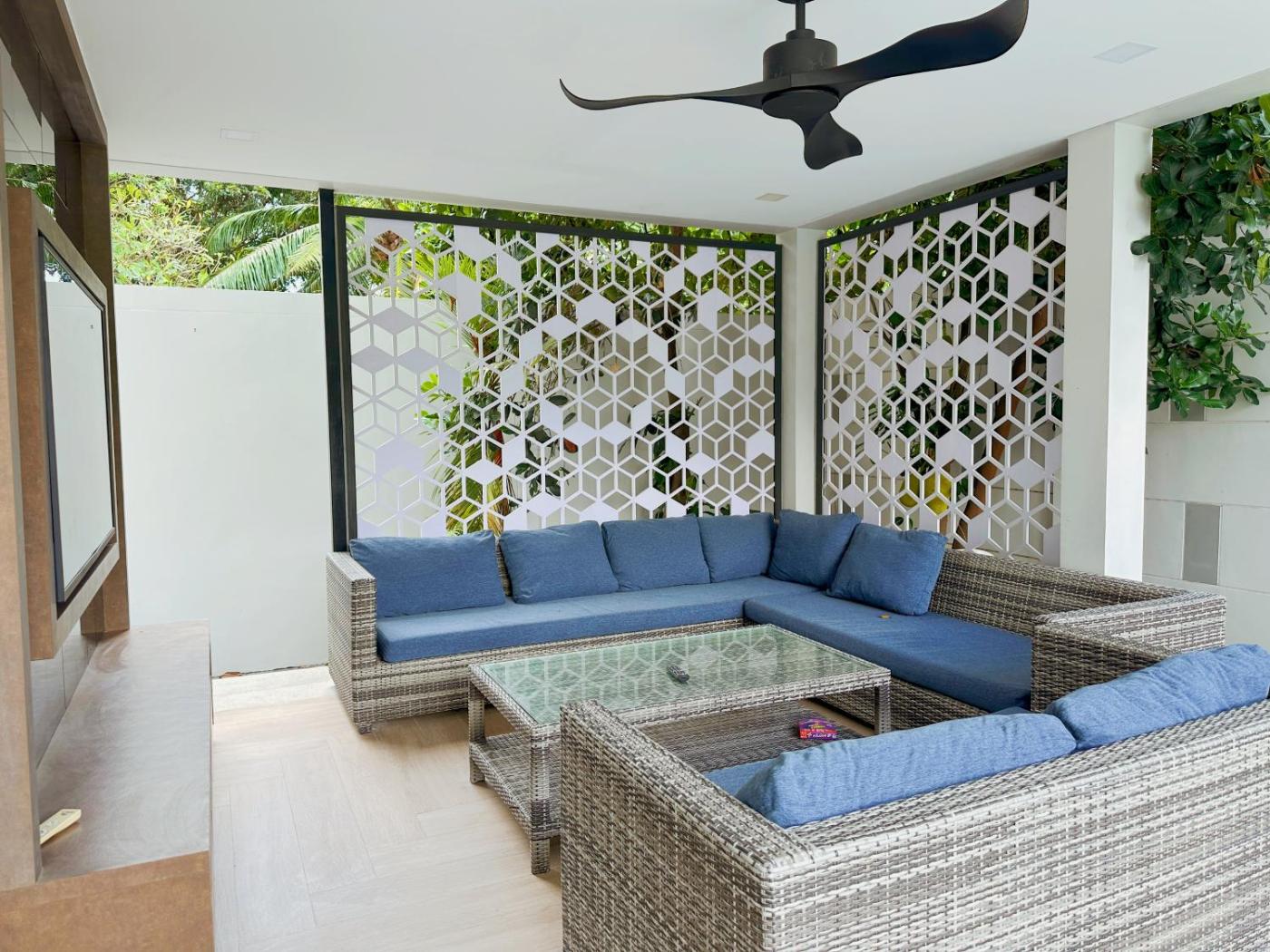 Villa. This villa provides a private pool. Boasting 5 bedrooms, this spacious villa has 5 bathrooms with a shower, a seating area and terraceyou can relax. The villas kitchen, which has a refrigerator and a microwave, is available for cooking and storing food. The air-conditioned villa offers a TV, a washing machine, soundproof walls, a dining area as well as garden views. The unit offers 5 beds.