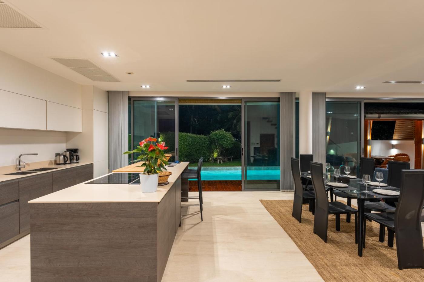 Three-Bedroom Villa. The pool with a view and hot tub are the special features of this villa. Guests will find a refrigerator, a dishwasher, kitchenware and an oven in the well-fitted kitchen. The villa also features a barbecue. The spacious air-conditioned villa offers a flat-screen TV, a washing machine, a private entrance, a tea and coffee maker as well as sea views. The unit has 3 beds.