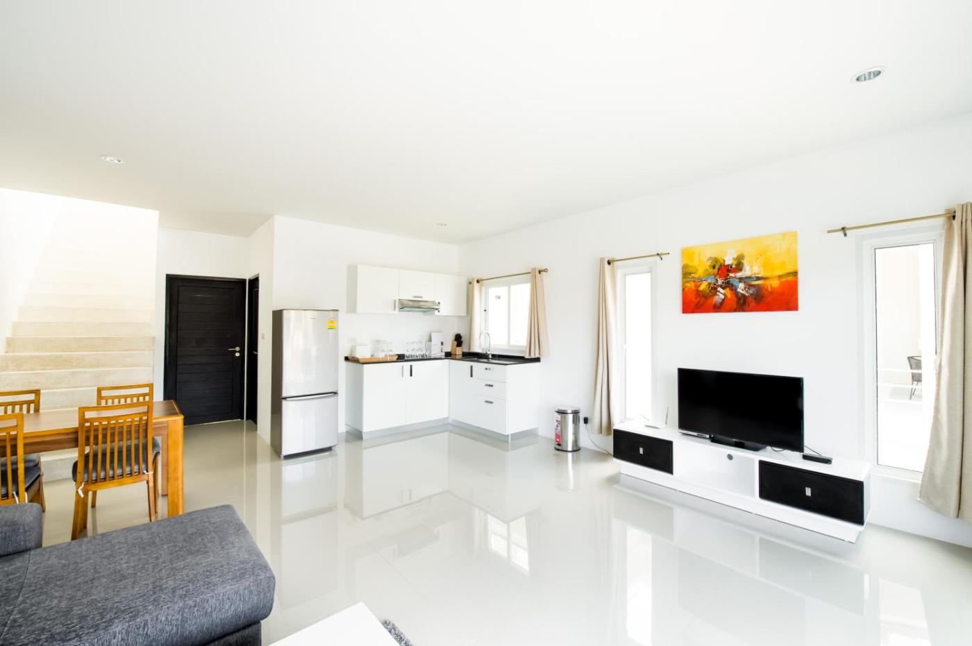 Deluxe Villa. This two-bedroom villa features a rooftop terrace with a spa pool and an outdoor kitchen. It has a fully-equipped kitchen and a separate living room with a 42-inch flat-screen satellite TV and a DVD player. An en suite bathroom comes with a rain shower. ;