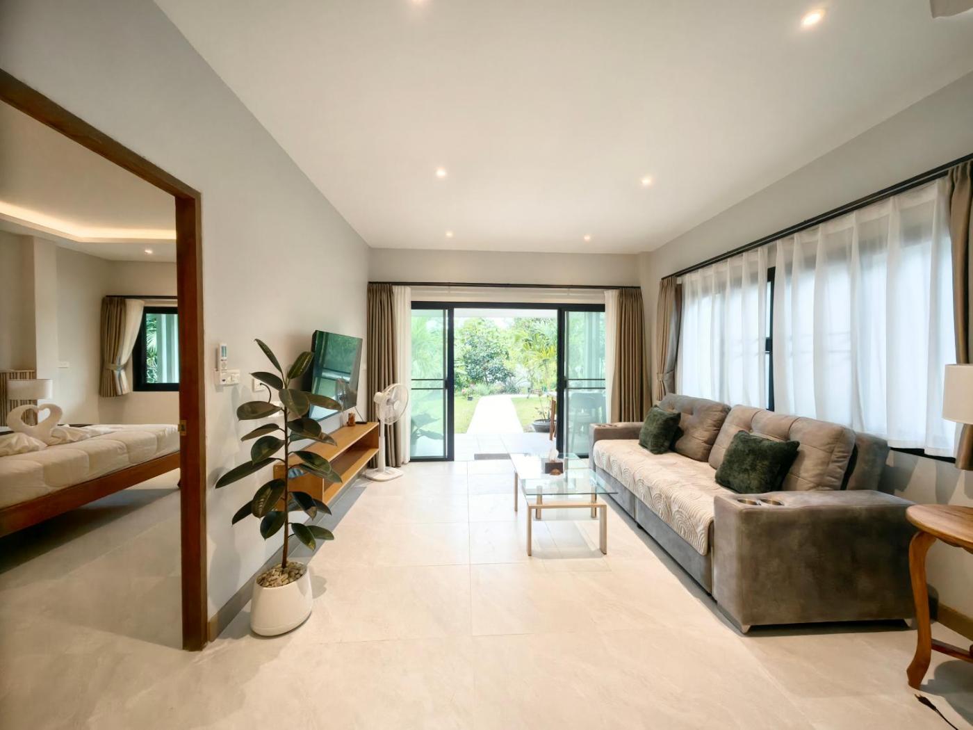 Deluxe Double Studio. Surrounded by greenery, this single room has a balcony, kitchen and . It also comes with air conditioning and a private bathroom. A quiet modern house in a lush garden, with an air-conditioned bedroom, full kitchen and stylish bathroom. Just 10 minutes’ walk to the beach and restaurants. 15 minute drive to Fisherman Village. The house surrounded by peaceful fields and trees, it’s a hidden escape that’s still close to everything.